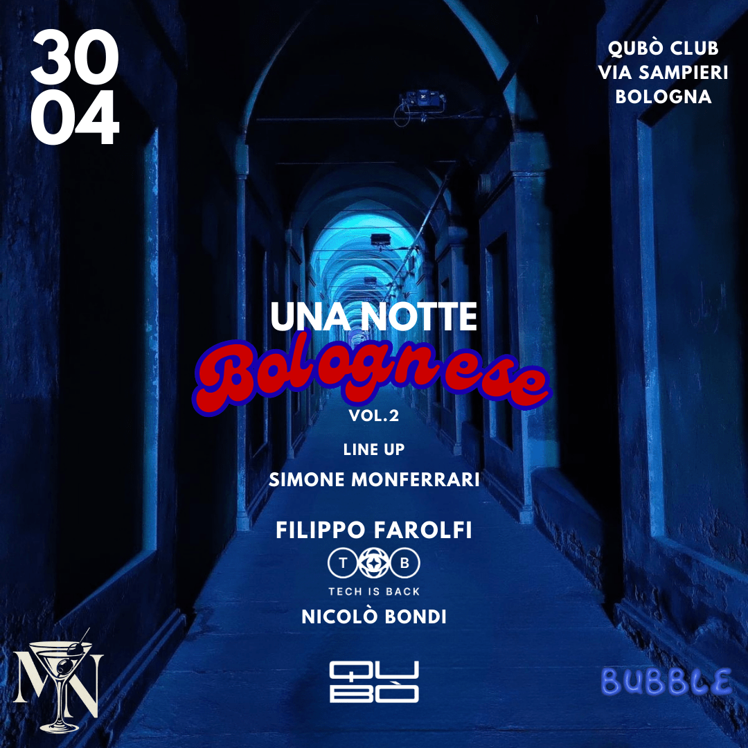 EVENTI DISCOTECA Bubble – Una Notte Bolognese Bubble – Una Notte Bolognese 30/04/2026 | 1 Evento Qubò Via Sampieri 3, 40125 Bologna, Emilia-Romagna Italia Una Notte Bolognese! Giovedì 30 Aprile Prefestivo Ci vediamo sotto le due torri per una notte Bolognese! Link Ig https://www.instagram.com/bubblebologna?igsh=MWFibTk3eGplMHp4NA Link Telegram https://t.me/+0AaAeaO9hAkxNmY8 Acquista ora BIGLIETTI 30 Apr 2026 23:30Bubble – Una Notte Bolognese Via Sampieri 3, 40125 Bologna, Emilia-Romagna Italia da € 15,00 + commissioni Acquista ora LUOGO Qubò Via Sampieri 3, 40125 Bologna, Emilia-Romagna Italia Carte di credito Taxi Evento over 18 Evento indoor EVENTI CORRELATI We Love 2000 We Are Erasmus martedì 10 Marzo / 23:30 descrizione acquista Bubble KeyLove Edition giovedì 12 Marzo / 23:30 descrizione acquista CIAO! Il Giovedì universitario giovedì 12 Marzo / 23:30 descrizione acquista Qubò XXL venerdì 13 Marzo / 23:30 descrizione acquista Ovrtm venerdì 13 Marzo / 23:30 descrizione acquista Bailao sabato 14 Marzo / 23:30 descrizione acquista Pulse sabato 14 Marzo / 23:30 descrizione acquista Eclettica 12 sabato 14 Marzo / 23:30 descrizione acquista Decadence venerdì 20 Marzo / 22:30 descrizione acquista Teenage Dream sabato 21 Marzo / 21:30 descrizione acquista Lacrima sabato 21 Marzo / 23:00 descrizione acquista Soul Fingers sabato 21 Marzo / 23:30 descrizione acquista Bubble giovedì 26 Marzo / 23:30 descrizione acquista Bubble – Una Notte Bolognese giovedì 30 Aprile / 23:30 descrizione acquista